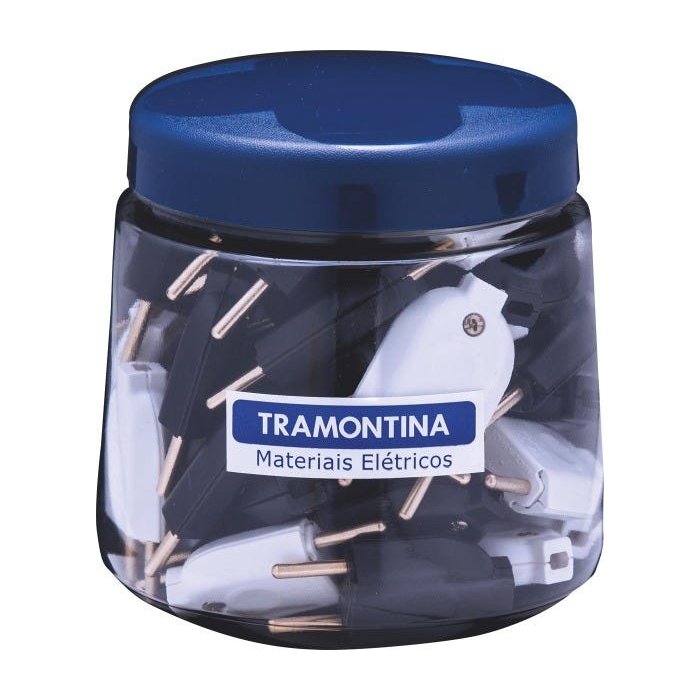 Plugues macho embalados em pote plástico contendo 42 unidades, nas cores preto e branco. Os plugues são produzidos em termoplástico antichama, com componentes condutores e pino maciço em liga de cobre.