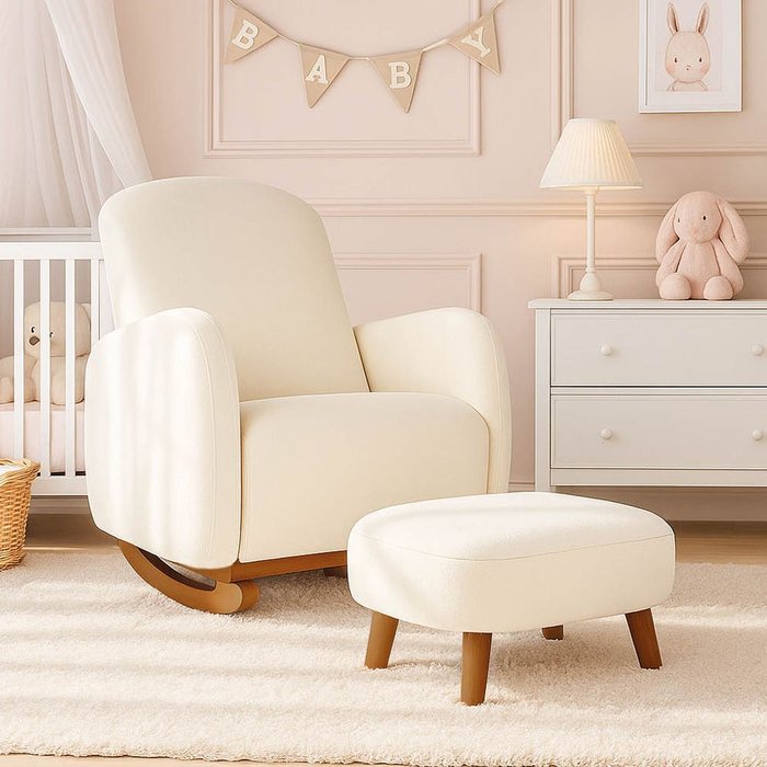 Poltrona Amamentação Balanço Madeira e Puff Jhessy Bouclê R04 - D'rossi Bege