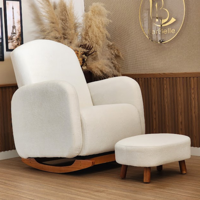 A Poltrona de Amamentação Organite une conforto e estilo com seu design orgânico e base canoa em madeira maciça. Estofada com espuma de alta densidade e manta de plumante, oferece o suporte ideal para a mãe e o bebê, tornando o momento da amamentação mais aconchegante e especial. Um móvel pensado para cuidar de quem cuida.