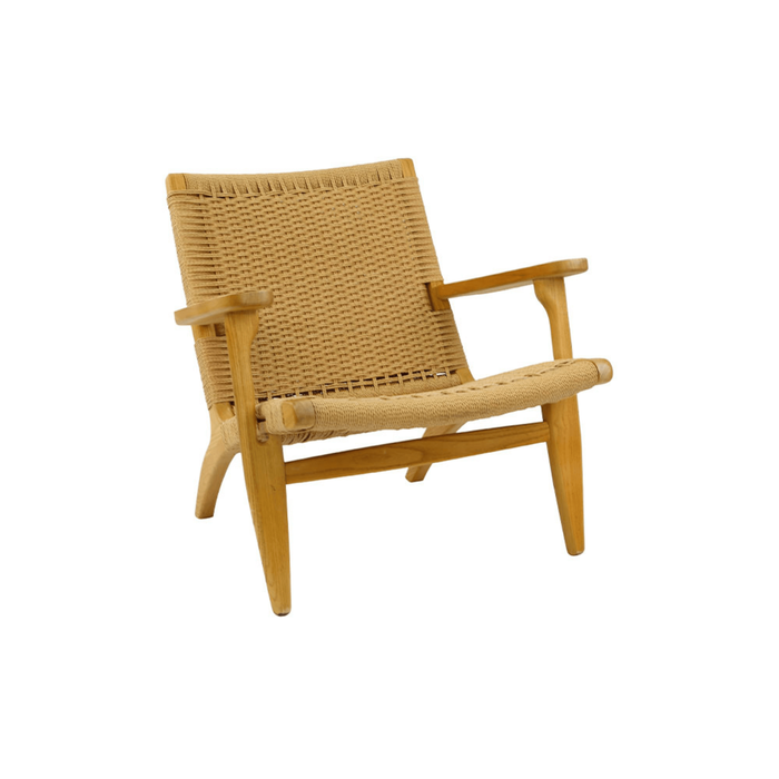 Poltrona em madeira de olmo com assento e encosto tramado em corda natural.