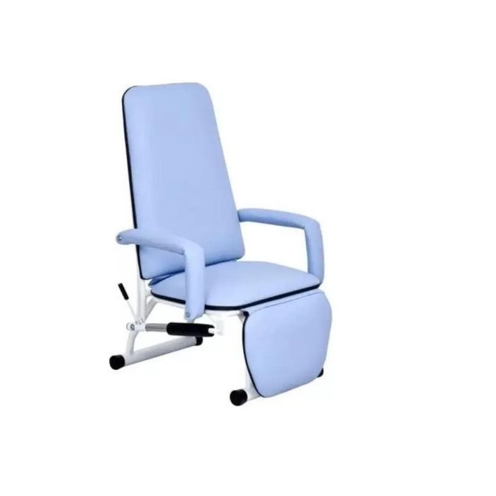 Construída em estrutura tubular com acabamento em pintura epoxi. Encosto assento pernas e braços com estofamento anatômico revestido em corino preto. Braços e pernas articuláveis que se movimentam junto com a inclinação do encosto (concomitantes) movimentos de fácil manuseio feitos por meio de pistão a gás.