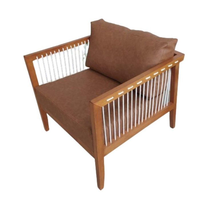 Poltrona Berlim com Braço Madeira e Cordas Tecido Couro Caramelo