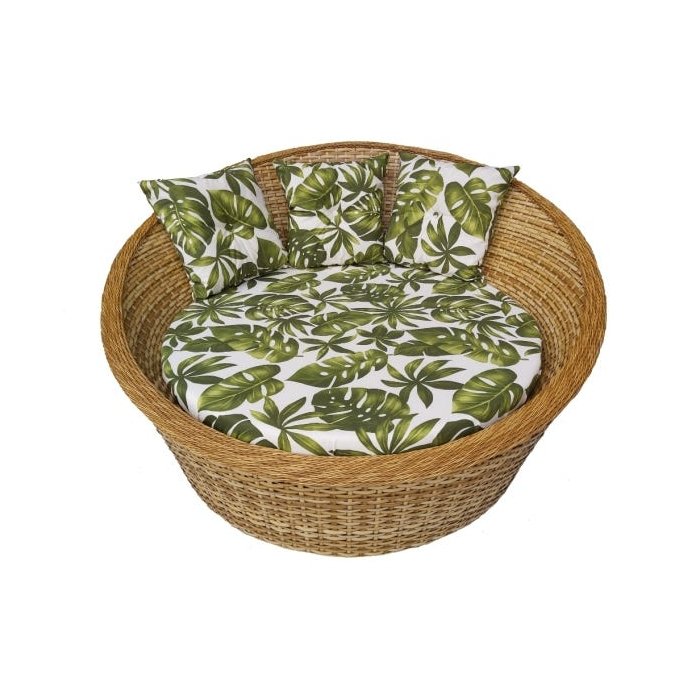 Poltrona chaise Palha Natural Kit composto por 1 chaise com almofada de assento e 3 almofadas decorativas Fabricada com estrutura de alumínio tubular certificado com solda Mig. Revestida artesanalmente em fibra sintética siliconada na cor Palha Natural com tratamento UV, resistente aos raios solares podendo ser lavado naturalmente sempre que for preciso. Almofadas são fabricadas com tecido impermeável da linha ACQUABLOCK da KARSTEN. Seguem na estampa ZIMBROS VERDES Medida da chaise Redonda 1.55 cm Almofada do assento 1.20 cm Almofadas decorativas 45/45 cm Produto original de alta qualidade e com fino acabamento fornecido pelo fabricante.