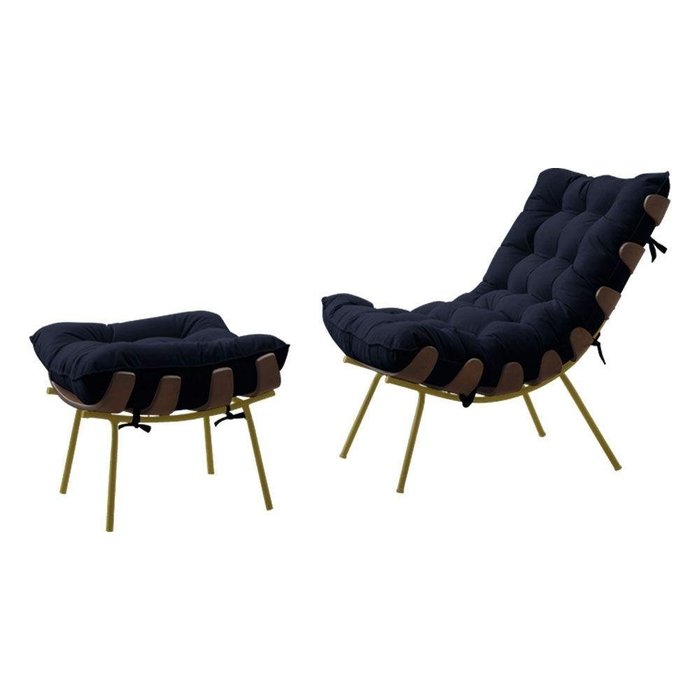 Poltrona Com Puff Costela Adão - Veludo Azul Marinho