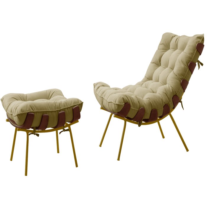 Poltrona com Puff Costela Sala Quarto Recepção Escritório Base Dourada Fixa Linho Bege
