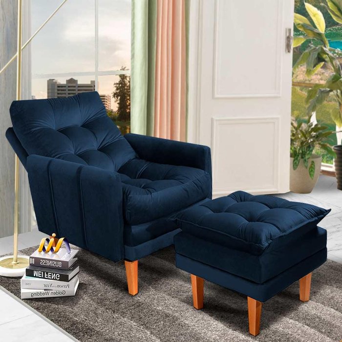 Poltrona Confortável Com Puff Veludo Azul Veneza Boutique Konforto