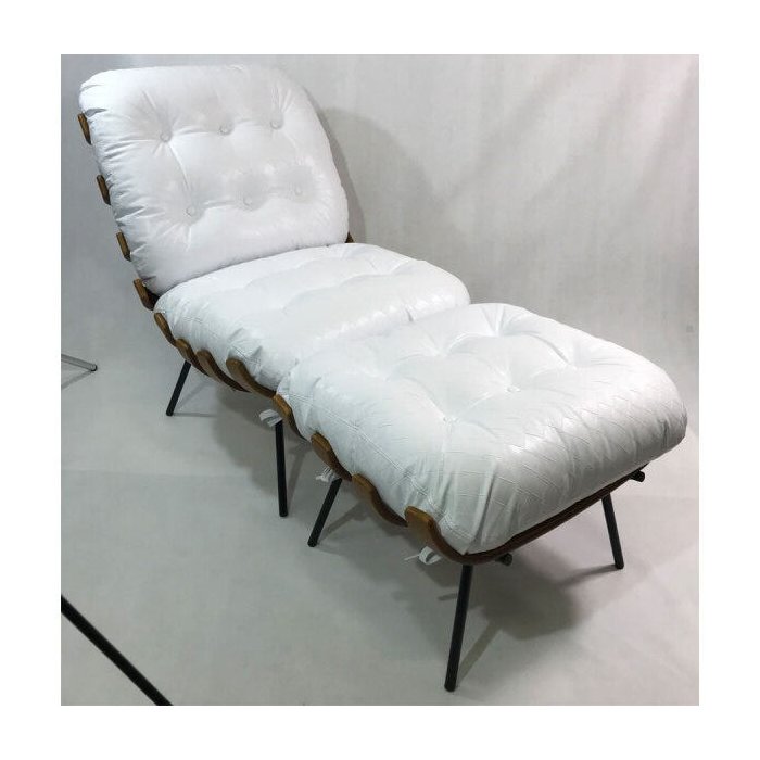 Descrição do Produto: Um clássico do mundo das poltronas, a poltrona Costela com puff é ideal para sua sala de estar. É produzida com acabamento e qualidade de alto padrão fiel aos traços originais do modelo de 1956 do designer Martin Eisler. Estrutura fabricada com chapas de madeira nobre natural de jequitiba em estufa em formato de "costela", na cor natural. Base com estrutura fixa produzida em aço carbono revestido com pintura eletrostática epóxi na cor preta. Acabamento das almofadas em botonê. Fibra siliconada 100% pura. Revestida em material sintético na cor branca.