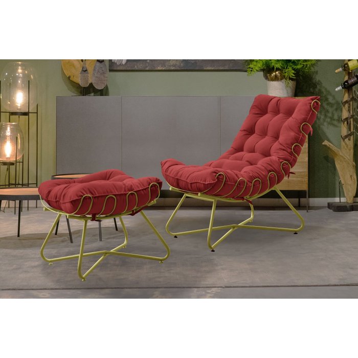 Poltrona Costela com Puff EVA Dourado - Veludo Vermelho Veludo Vermelho