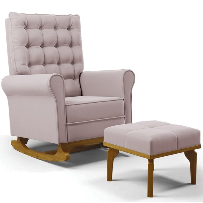 Poltrona de Amamentação Balanço e Puff Base de Madeira Brenda G05 Veludo Rosê - Mpozenato