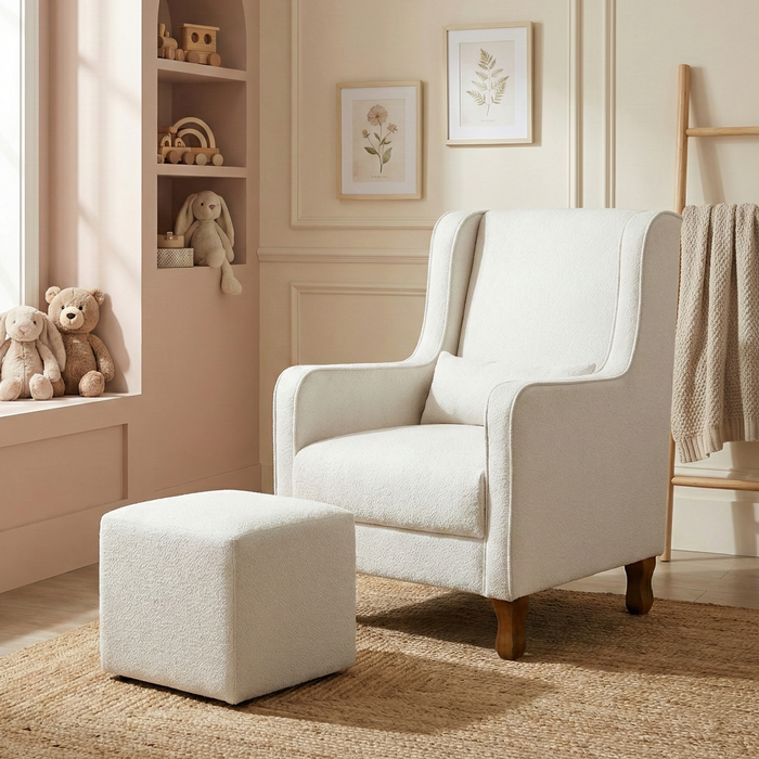 Poltrona de Amamentação Fixa com Puff e Almofada Bouclé Bege Sophia