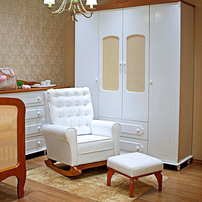 Poltrona de Amamentação Paris Base Balanço C/ Puff Retrô Courino Branco