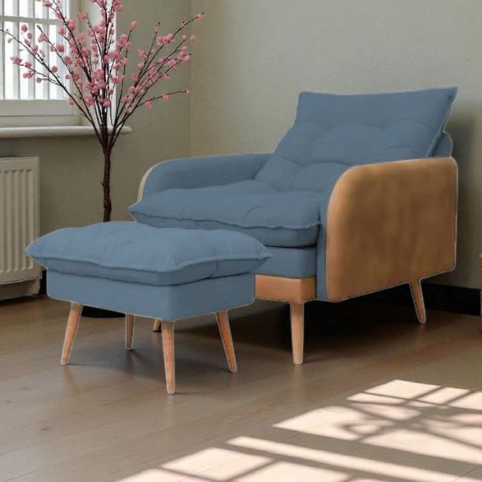 Poltrona de Amamentação Reclinável 5 Posições com Puff Linho Azul Marinho com Corino Nozes