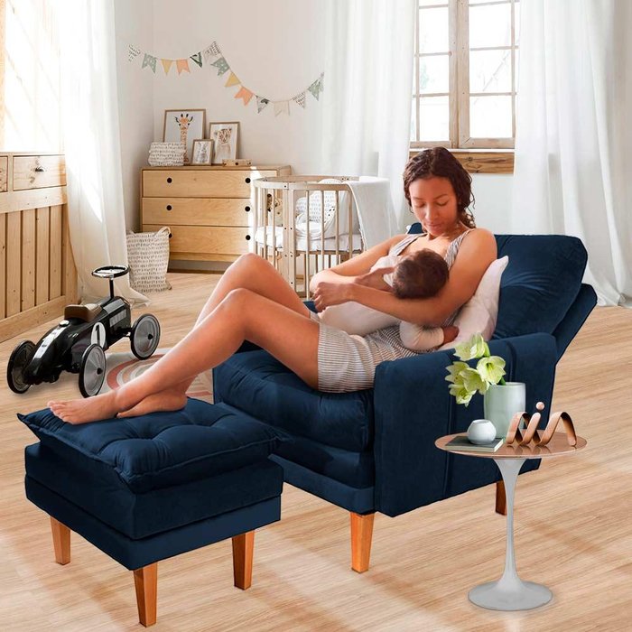 Poltrona De Amamentação Reclinável Com Puff Veludo Azul Veneza Boutique Konforto