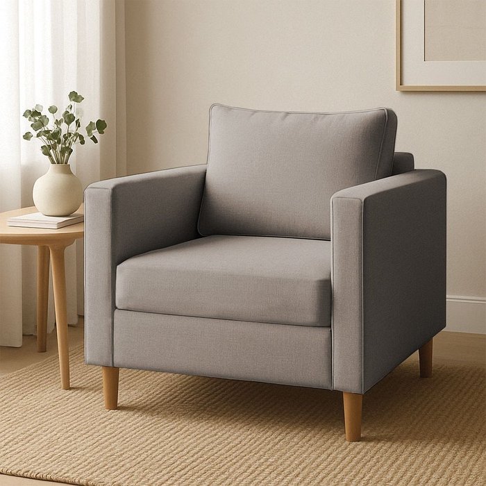 Medidas:- Altura total: 82cm- Largura total: 82cm- Profundidade: 80cmInformações técnicas:- Assento fixo- Almofada do encosto solta- Tecido Linho- Estrutura: Madeira eucalipto- Enchimento da almofada: Fibra siliconada- Espuma: D23- 04 Pés de madeira de 12 cm- Peso suportado: 160kg