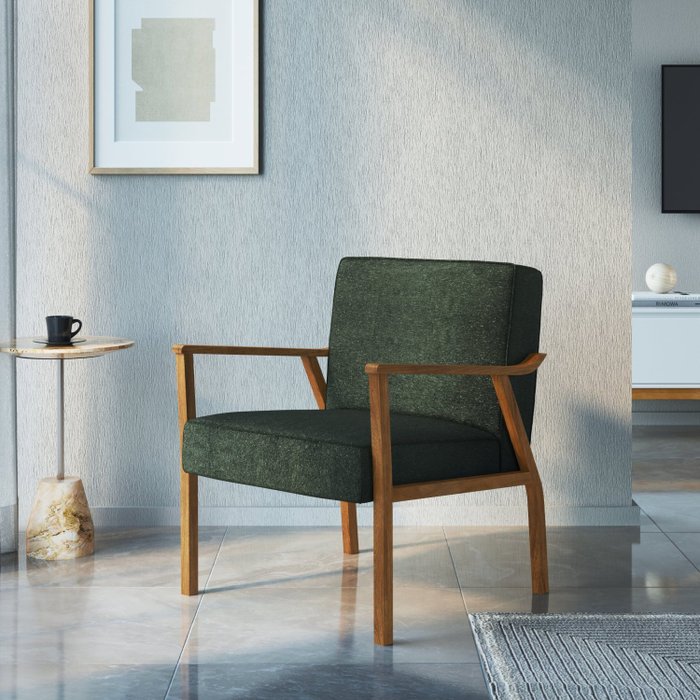 Poltrona estofada revestida com tecido de alta qualidade, assento com persintas elásticas, espuma de densidade 26, pés em madeira de lei jequitibá. Uma poltrona que se destaca em qualquer ambiente, deixando-o muito estiloso e aconchegante.