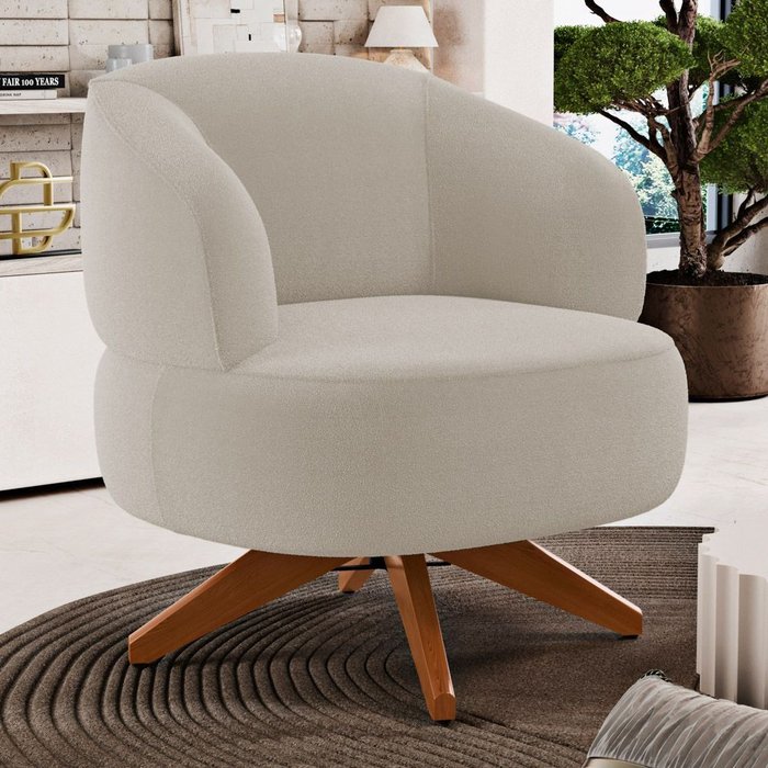 Poltrona Decorativa Orgânica Living Have Base Madeira Giratória Bouclê Bege - Desk Design