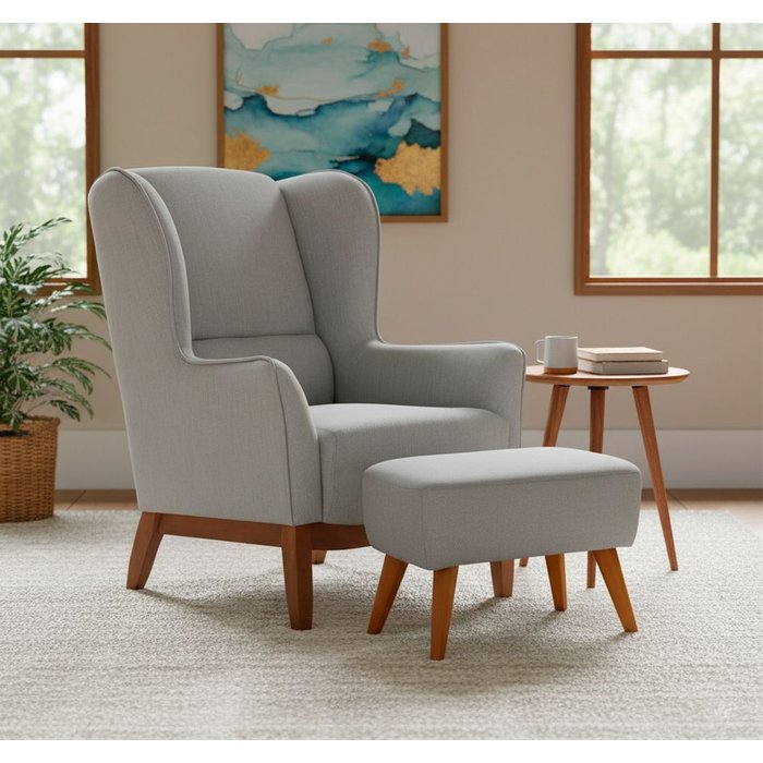 Poltrona Dekorien Milena Linho Cinza Claro com Puff Premium Decoração