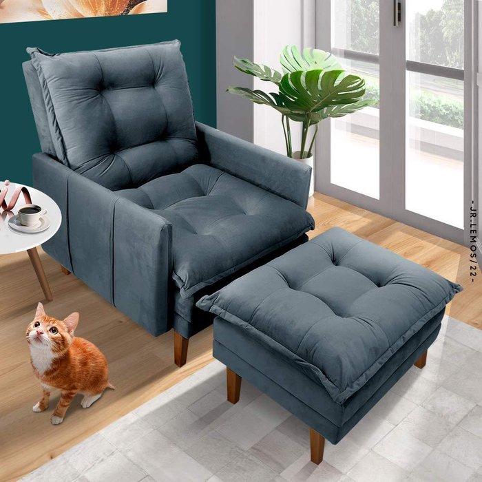 Dimensões da poltrona: Largura 68 cm; Profundidade 85 cm; Altura 90 cm; Profundidade deitada 120 cmDimensões do puff: Largura 45 cm; Profundidade 45 cm; Altura 50 cmItens Inclusos: 1 poltrona e 1 puff- Poltrona reclinável em 3 níveis- Acompanha 1 puff- Extremamente confortável- Revestimento em veludo- Pode ser reclinada totalmente para deitar- Estrutura e pés em madeira maciça 100% de reflorestamento- Almofadas fixas no encosto com fibras de poliéster siliconadas- Braços com espuma D28- Suporta até 120 kgComplexidade da montagem: Fácil, pode ser montado por apenas uma pessoa e/ou necessite de maior conhecimento para montagem.Recomendações de uso, manutenção e limpeza: Limpar com flanela ou pano macio seco, não utilizar produtos abrasivos, desengordurantes, álcool ou solvente. Não expor o produto diretamente a luz solar e à umidadeGarantia: 3 mesesOBS: Foto meramente ilustrativa, objetos, utensílios e decoração não fazem parte do produto.