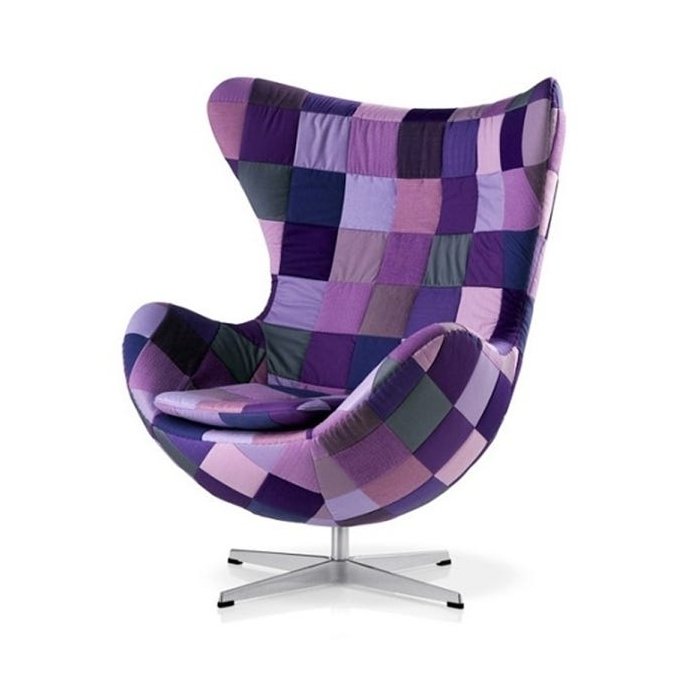Poltrona, Cadeira Egg Patchwork possui acabamento e qualidade de alto padrão fiel aos traços originais do modelo de 1957 do designer Arne Jacobsen, possui base giratória rolamentada em aluminio fundido, injetado e polido com giro macio e de longa durabilidade, mecanismo relax basculante com ajuste de reclinagem, concha em fibra de vidro estofada em espuma certificada 100% poliuretano D28, revestida em tecido em forma de patchwork quadriculados em várias opções de cores e padrões.