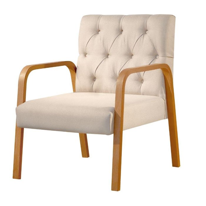 Poltrona Ellie Linho Nude com Capitonê e Base Madeira bege