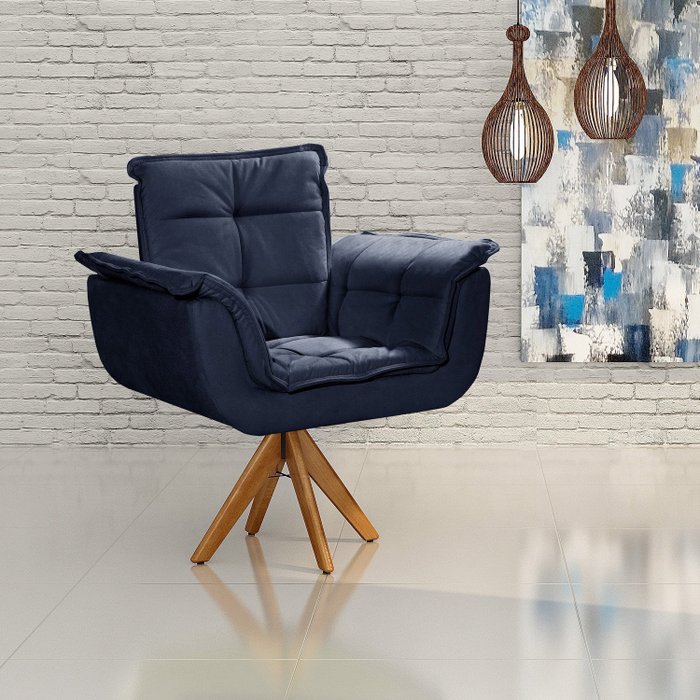 Poltrona Giratória de Madeira Bella Opala Decoração Sala Quarto Recepção Azul Marinho