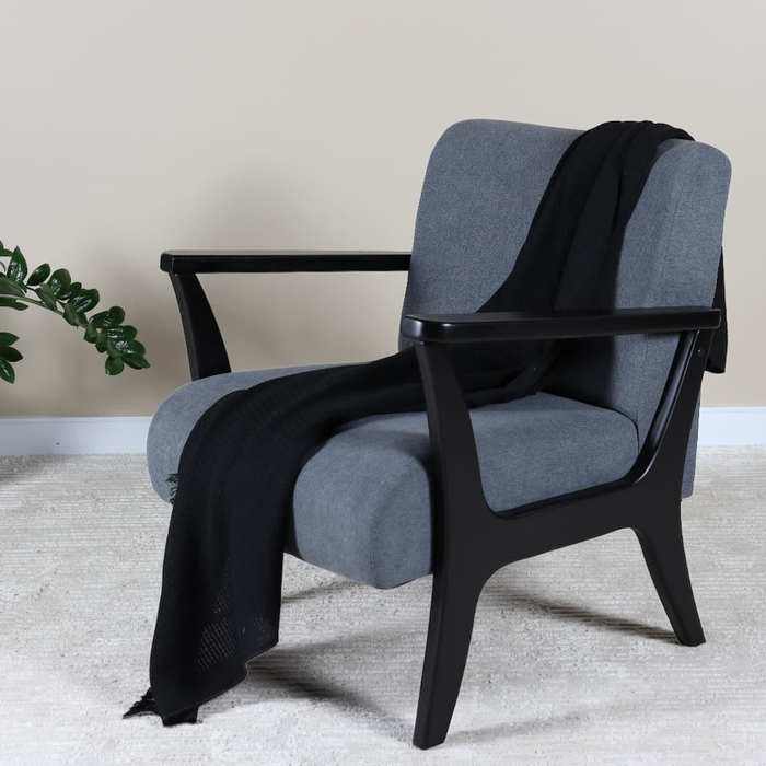 Poltrona Glamour em Madeira Maciça Ébano Preto com Assento e Encosto Estofado Tecido Grafite