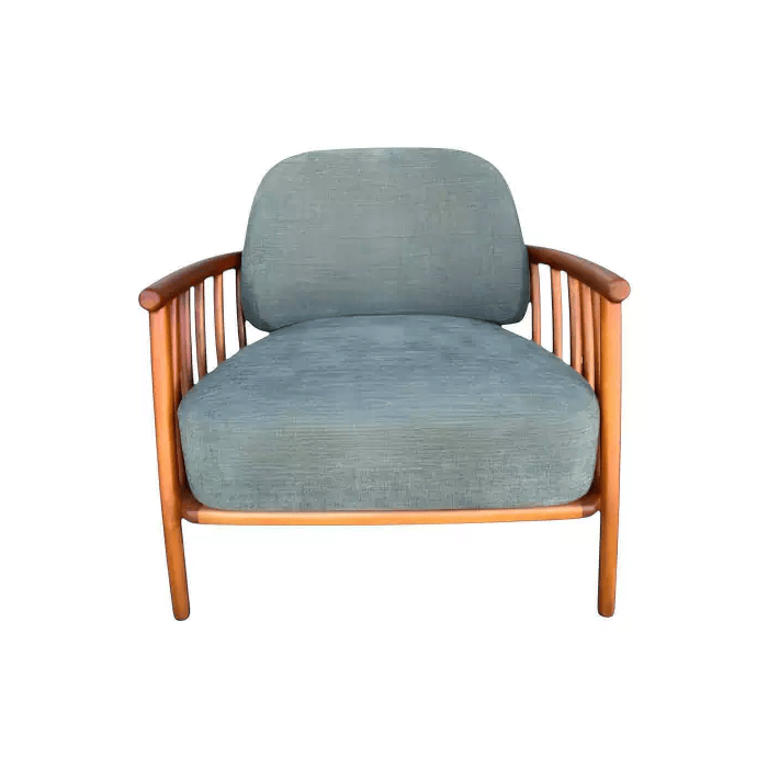 A Poltrona apresenta uma estrutura de madeira maciça, combinando rusticidade e modernidade. Seu assento e encosto estofados oferecem um toque de suavidade, enquanto os traços curvos proporcionam um visual único e harmonioso.