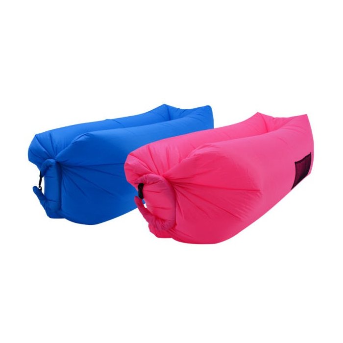 Kit com 2 Sofás/Puffs infláveis do tipo AirSofa feito na cor Azul e Rosa em Poliéster de Alta Qualidade com 240x90x65cm, com Bolso Lateral, Estaca para fixação no solo e Mochila para transporte.