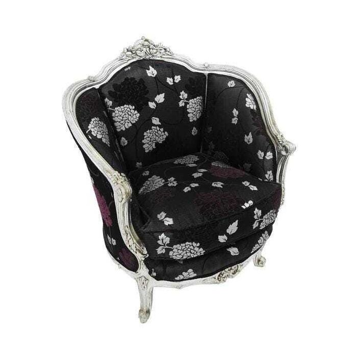 Poltrona Luis XV Prateada Estofado Preto Florido