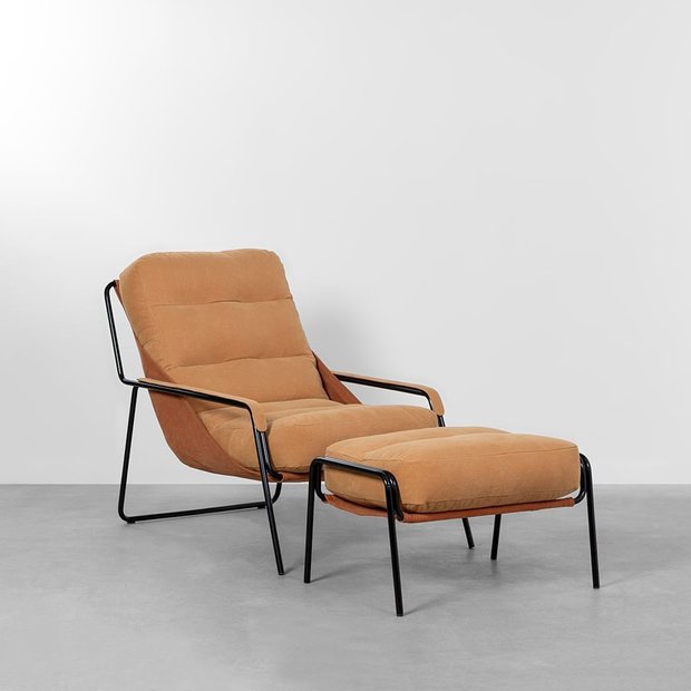 Sua estrutura em metal com pintura epóxi garante resistência e durabilidade, enquanto o assento e o encosto com enchimento em pluma siliconada proporcionam uma experiência confortável e envolvente. A base de sustentação das almofadas em lona reforça o caráter original do design, unindo funcionalidade e estilo em uma composição versátil, pensada para o uso cotidiano e momentos de pausa.
