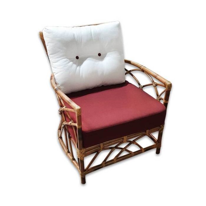 Produzida com estrutura em rottin e junco, a poltrona Nick combina com áreas de churrasco, áreas gourmet, varandas de ranchos ou chácaras, pode ser usada também em salas de estar e jantar. O estofado confortável é revestido com tecido tipo sarja na cor vinho no assento e na cor branca no encosto.