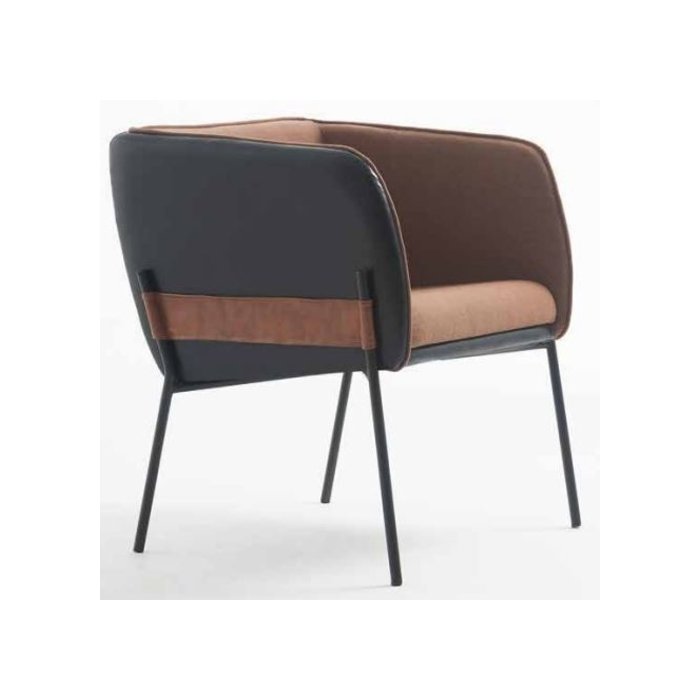 Poltrona estofada. Base em aço pintado. Detalhe de cinta ao lado
