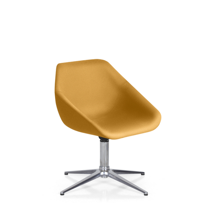 Cadeira é composta por uma estrela e uma base em aço de alta qualidade e resistência, um assento concha com espuma e um acabamento em tecido crepe.