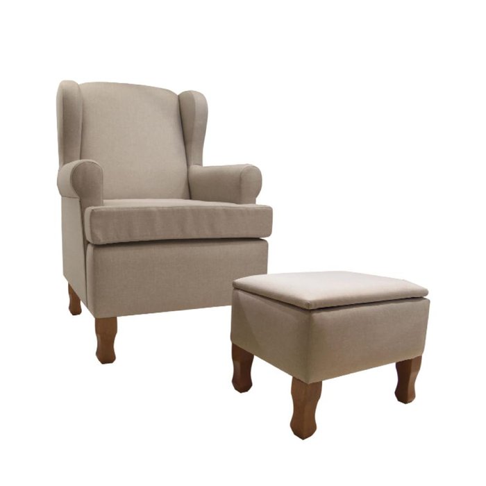 Poltrona para Amamentação Maria Vitória em Linho com Pés em Madeira e Puff Baú - Bege