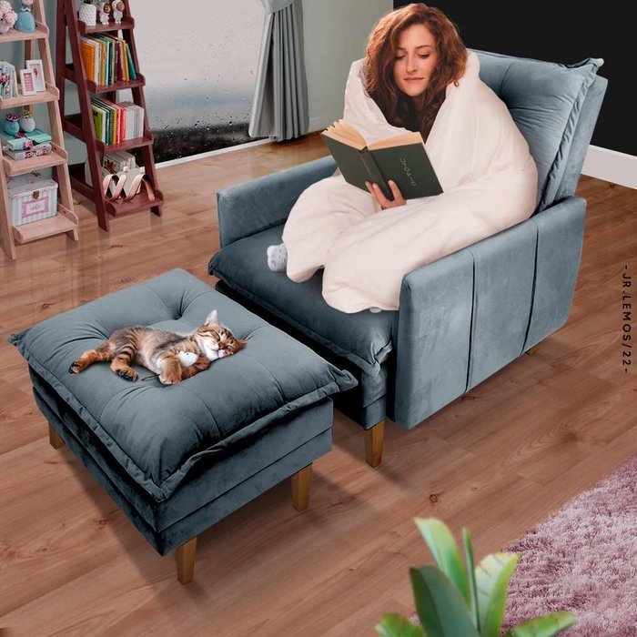 Poltrona Para Leitura Reclinável Com Puff Veludo Grafite Cinza Polonia Shop JM