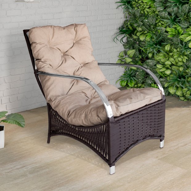 A poltrona é produzida em Alumínio e tem acabamento em Fibra Sintética de alta qualidade. A almofada que acompanha a poltrona tem um assento Impermeável, revestido com espuma de alta densidade (D28), o que proporciona um conforto excepcional.
