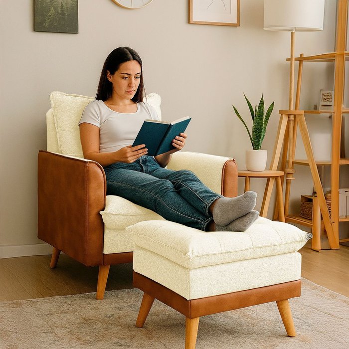Poltrona Sofá Reclinável Londres com Puff Banqueta Almofadado Corino Nozes e Linho Bege - Arkell