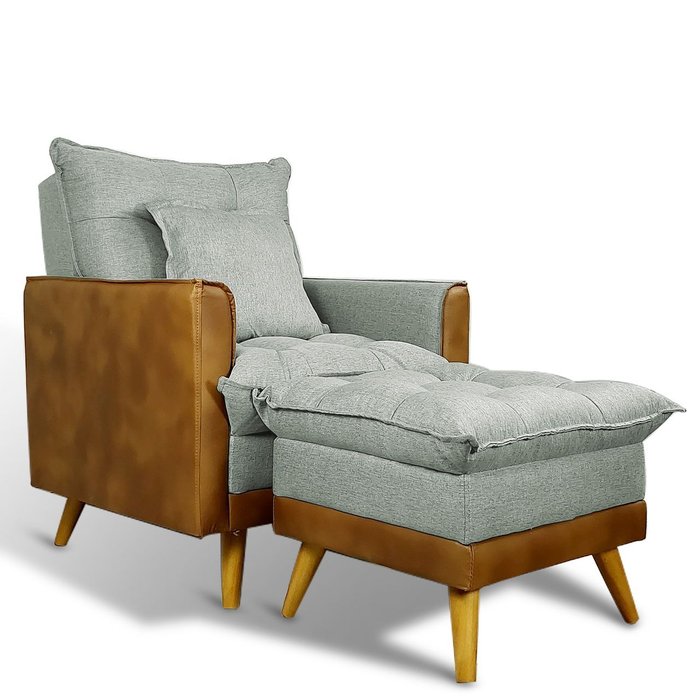 Poltrona Sofá Reclinável Londres com Puff Banqueta Almofadado Corino Nozes e Linho Cinza - Arkell