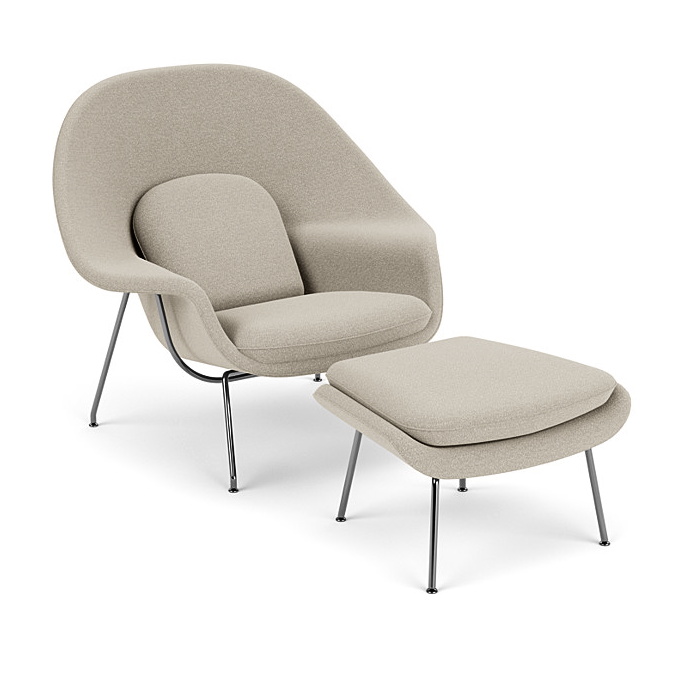 Projetada por Eero Saarinen a pedido de Florence Knoll em 1946, a cadeira Womb foi considerada revolucionária por muitos, não apenas por sua aparência, mas também por sua estrutura, sendo um modelo que continua ainda muito popular hoje em dia por ser facilmente incorporada na maioria dos estilos. Com sua forma imponente e um design inovador, este modelo é muito confortável e altamente versátil para todos os ambientes. O apoio para os braços e o puff traz um grande conforto para leitura e também para amamentação. Com uma grande variedade de cores, você pode encontrar o modelo que melhor se adapta à sua decoração.
