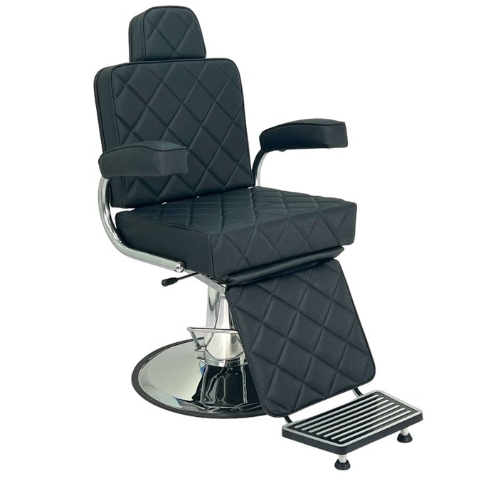 Estrutura de aço cromado e compensado, assento e encosto de espuma de alta densidade, costura trabalhada em courvim com ótima qualidade, disponível em várias cores, encosto de cabeça com regulagem de altura, apoio de braços, apoio de pés reclinável em aço cromado, pistão hidráulico e base redonda em aço cromado.