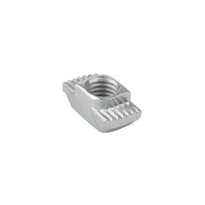 Esta porca é muito prática, pois pode ser inserida em qualquer ponto do canal do perfil, bastando introduzi-la longitudinalmente (já ligado a um parafuso) e girando em 90° no sentido horário, quando então se dará o aperto final.
