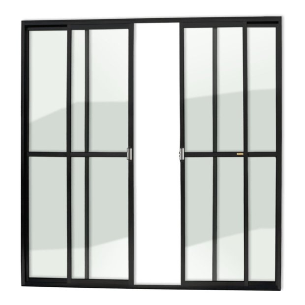 Porta Balcão 4 Folhas de Alumínio Linha Super 25 Pintura Eletrostática Preta 2 Folhas Fixas e 2 Folhas Móveis Vidro Liso Incolor 3mm Com Trinco Altura 210 Cm Largura 200 Cm Requadro 7,8 Cm Garantia de 5 anos contra defeitos de fabricação