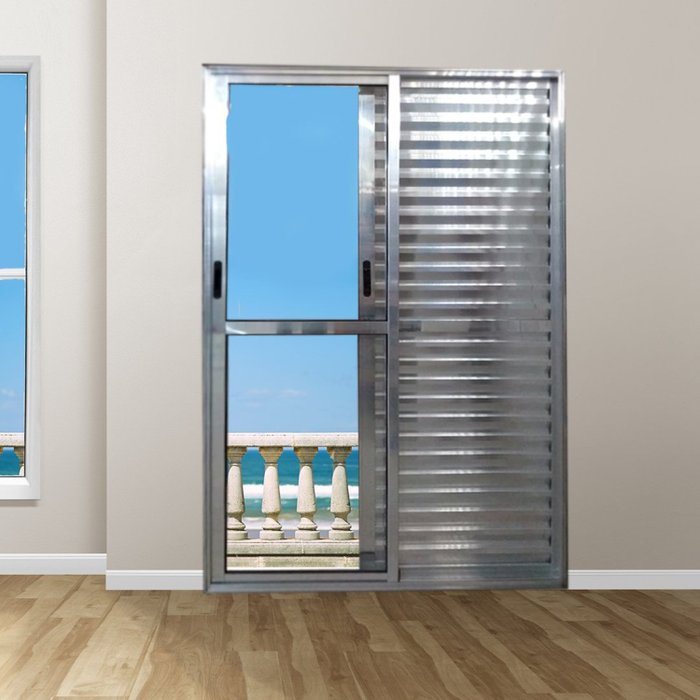 A porta balcão de correr tem uma folha do tipo veneziana, fixa do lado direito, tendo referência estar dentro do ambiente, e uma veneziana e uma de vidro que se movimentam.