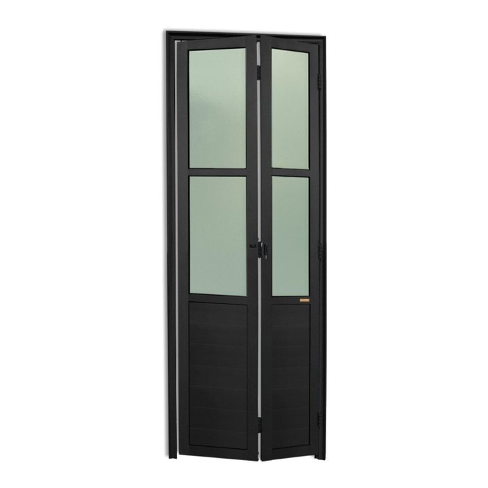 Portas de Abrir de Alumínio Linha L.25 Pintura Eletrostática Preta 2 Folhas de Sanfonar para o Lado Esquerdo Vidro Mini Boreal 4mm Lambris Horizontais na parte Inferior Trinco e Dobradiças na Cor do Produto Altura 210 Cm Largura 70 Cm Requadro 4,6 Cm Garantia de 5 anos contra defeitos de fabricação