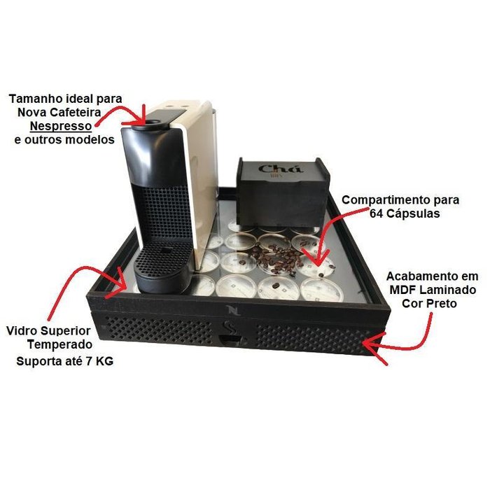 Este porta cápsulas foi desenvolvido pensando em beleza e praticidade, ele conta com compartimento para cápsulas Nespresso Tradicional, vidro superior temperado possibilitando colocar a cafeteira em cima da bandeja e as decorações conforme seu gosto.