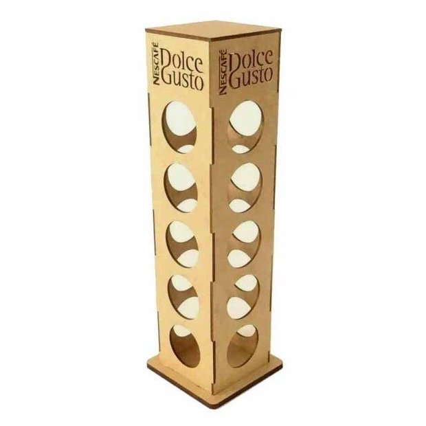 Espessura: 3MMLargura: 11cmComprimento: 11cmAltura: 36cmPeso: 0,285gCor: Crú - Sem pintarCorte a laserPara 20 cápsulas Dolce Gusto