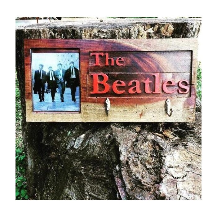 Porta casacos BEATLES feito em madeira de demolição com acabamento em resina epóxi e escrita em Relevo. 2 ganchos.