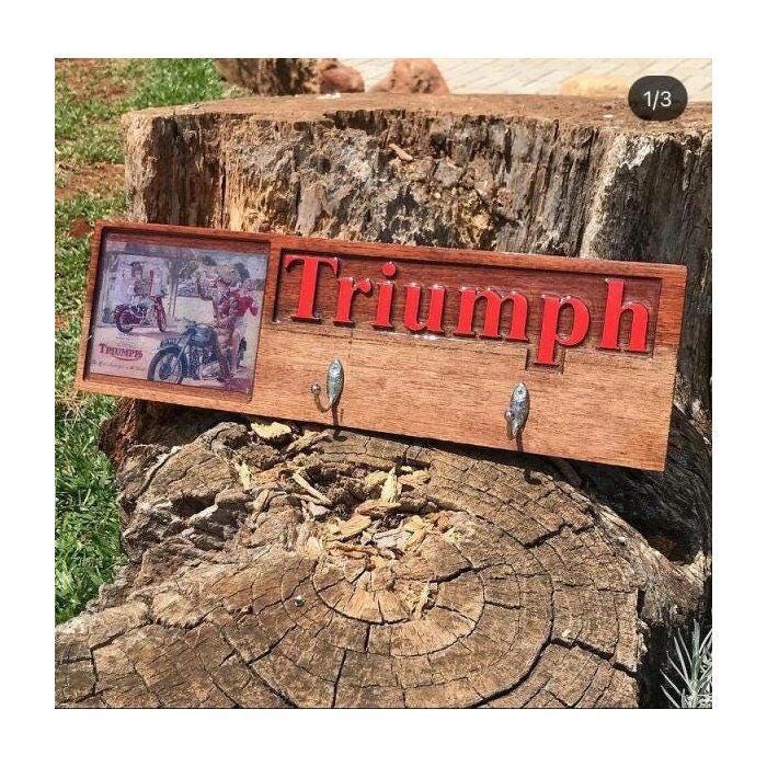 Porta casacos TRIUMPH feito em madeira de lei cedro mesclado, com acabamento em resina epóxi. Escrita em relevo e acabamento em resina epóxi. 2 ganchos.