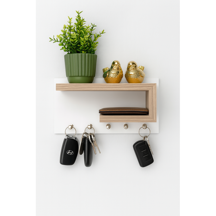 Porta Chaves com Prateleira Decoração e Carteira Oculos Mdf Branco com Madeira