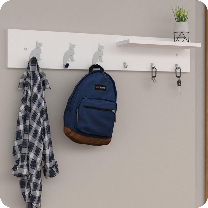 Ninguém gosta de perder a chave, não é mesmo?O Porta Chaves além de organização, também proporciona mais sofisticação para sua casa com seu design moderno e exclusivo.Além das chaves, também é possível guardar outros objetos como blusas, bonés, carteira, celular ou decorar com vaso de plantas ou porta-retratos. O Design minimalista é uma tendência que chegou para ficar!O Porta Chaves Cabideiro de Parede une o design moderno e minimalista com boa qualidade de acabamento. Os ganchos de aço proporcionam mais resistência e segurança para armazenar seus objetos preferidos.O gancho no formato de Cachorro faz com que seu ambiente fique alegre e com muita personalidade, dando um toque especial no seu lar. BENEFÍCIOSDesign exclusivos dos ganchos de CachorroGanchos pet de aço com corte preciso feito à laser de última geraçãoRecorte das bordas com extrema precisãoMadeira com espessura de 15mm (1,5cm)Durabilidade maior devido a resistência dos materiais utilizadosAcompanha acabamento para esconder a cabeça dos parafusos de fixaçãoMaior resistência de peso nos ganchos de CachorroNível de instalação: FácilModo de instalar: Parafusar os ganchos na madeira, furar a parede e parafusar o porta chaves na parede. ESPECIFICAÇÕES TÉCNICASMaterial: MadeiraMaterial dos Ganchos de Cachorro: Aço 1020Material dos Ganchos Menores: Metal ZamacCor da Base: BrancoCor da Prateleira: BrancoCor/Acabamento dos Ganchos: Cromado Largura: 60cmAltura: 10cmEspessura: 1,5cmLargura da Prateleira: 10cmComprimento da Prateleira: 25cmEspessura da prateleira: 1,5cm CONTEÚDO DA EMBALAGEM1 Porta chaves com prateleira3 Ganchos comuns3 Ganchos no formato de CachorroParafusos e Buchas *OBS: Os objetos decorativos não acompanham o produto.